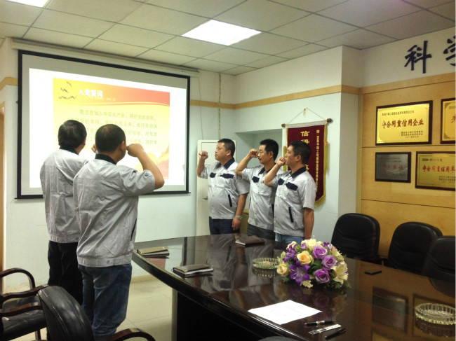公司全體黨員在支部書記盛斌同志的帶領下,不僅認真學習了《黨章》及《讀本》核心篇章,而且高舉右手面向黨旗重溫入黨誓詞。